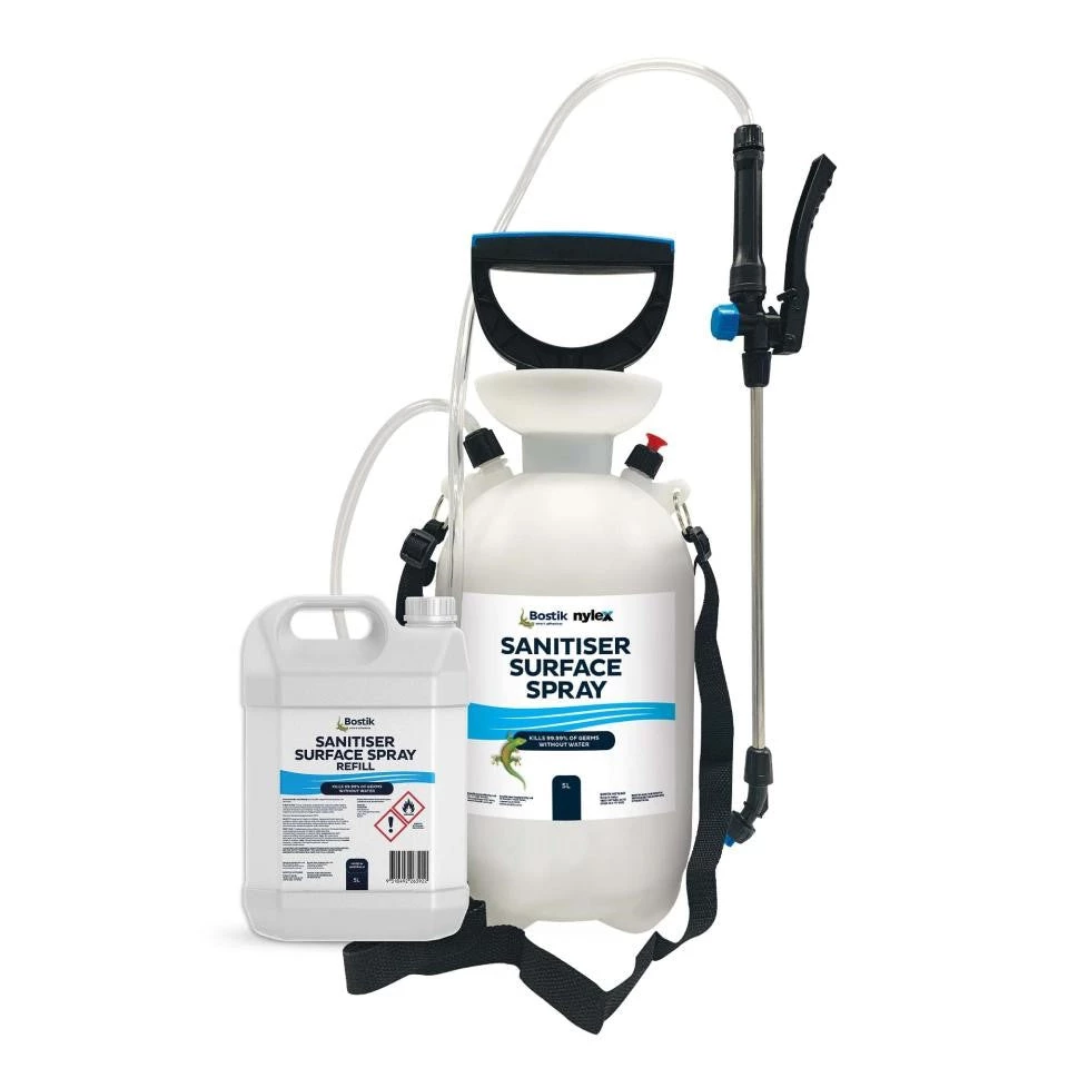 The Bostik Sanitiser surface spray can be applied to areas requiring a high level of hygiene. Designed to help fight germs and reduce cross contamination in a wide range of applications and environments. Ideal for use in office spaces, restaurants and food preparation areas, education facilities, playgrounds and equipment, public transport, public amenities, entryways and public spaces.
