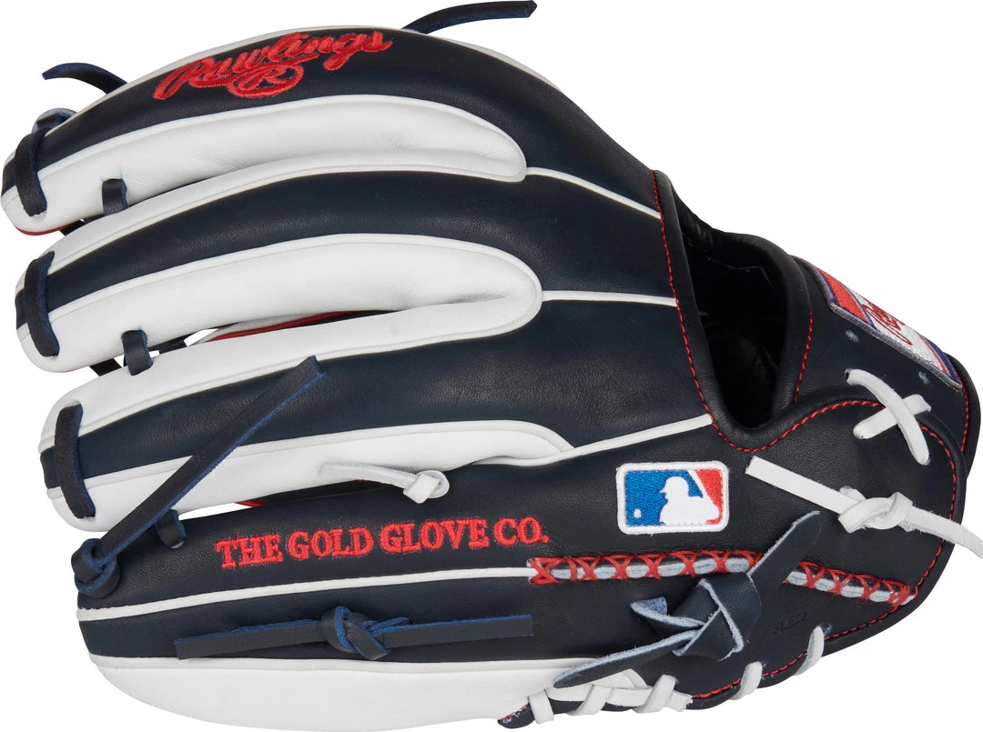 Add some style to your game with the Heart of the Hide ColorSync 5.0 11.5-inch I-web glove. It was meticulously crafted from ultra-premium steer-hide leather, and features a unique eye-catching navy, white, and red design. In addition, it was also constructed with deer-tanned cowhide, thermoformed wrist lining, a padded thumb sleeve, and hand-sewn welting to give you unmatched comfort and feel too. And it’s all tied together by the extremely rare red, white, and blue Rawlings ColorSync patch.Â